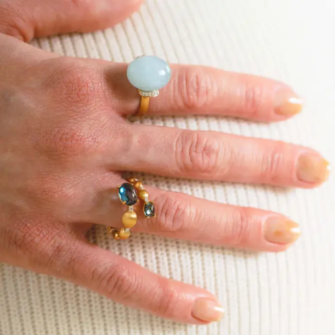 - Piedras preciosas como zafiros, topacios, granates y citrinos, cuidadosamente seleccionadas por su intensidad, calidad y rareza.