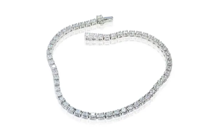 Una delicada pulsera de diamantes o una línea de tennis en oro 18k añade brillo sin robar protagonismo a los demás elementos del conjunto nupcial.