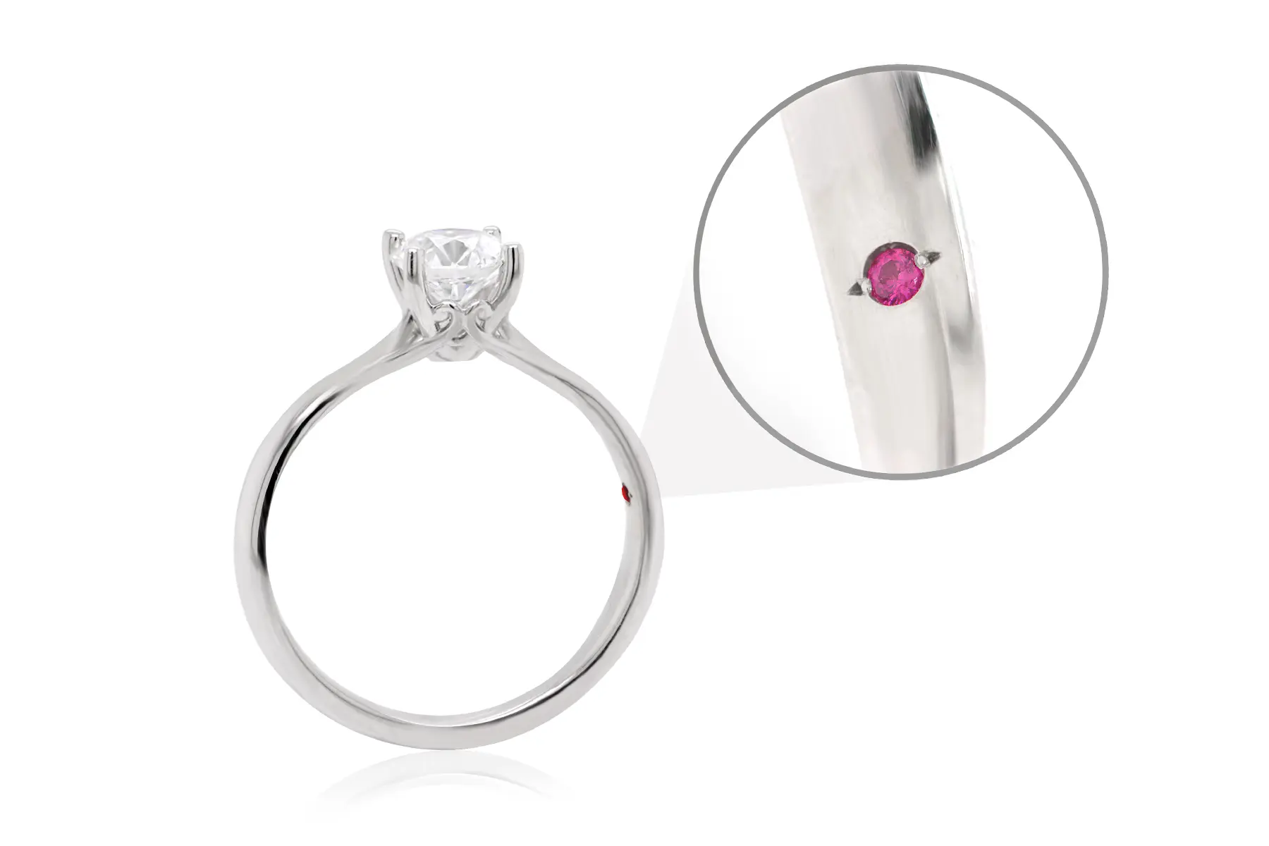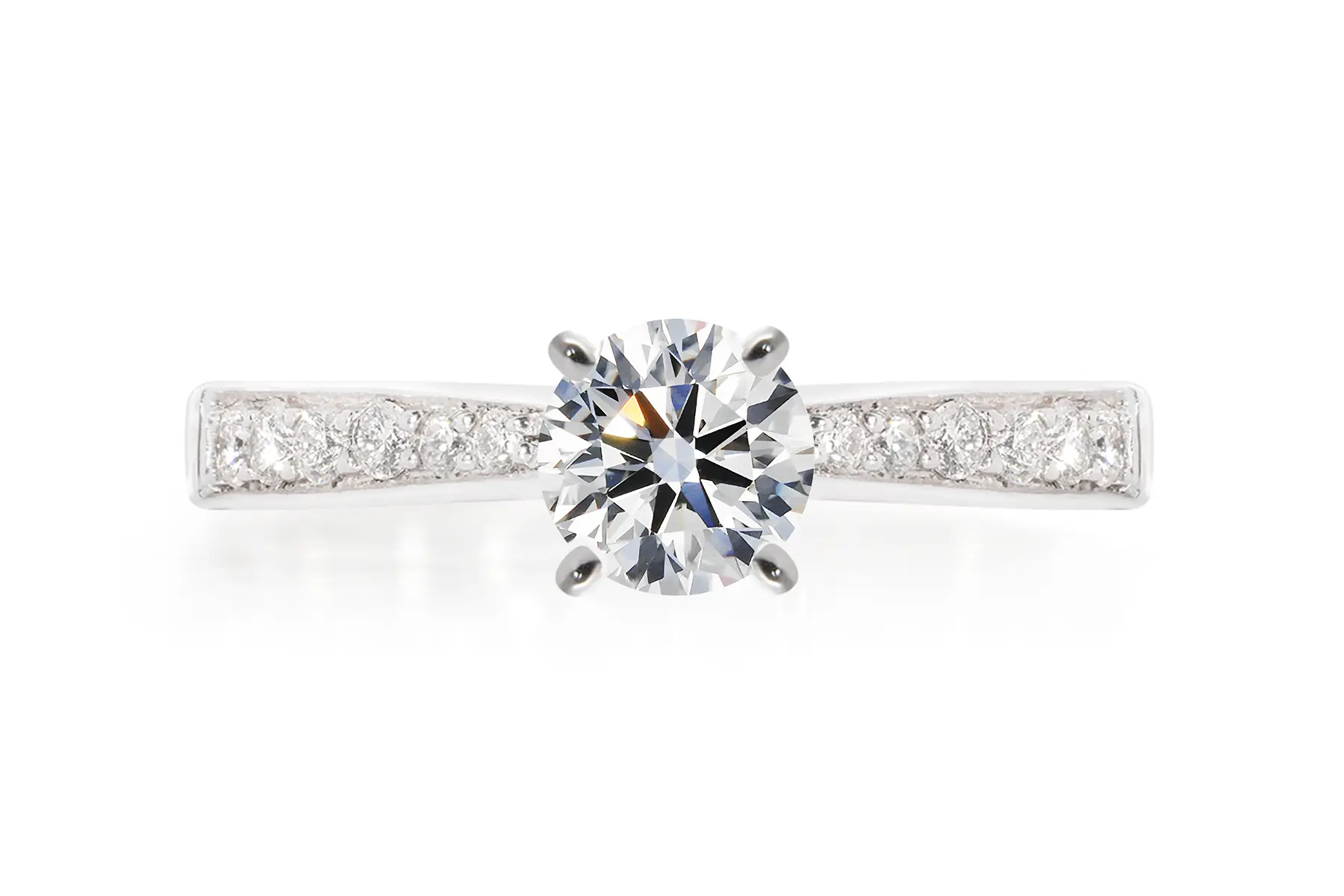 Nuestros anillos de compromiso tienen un exclusivo diamante Corte Ideal Original® el cual hace que la luz entrante baile en todas las facetas del interior del diamante y al salir destelle en la corona un espectáculo fascinante de los colores del arcoíris.